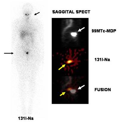 Spect with double window for 99mTc-MDP and 131I-Na was performed and seen at the right hand side. Upper image shows 99mTc-MDP saggital slice, being prominent the lumbo-sacrum spine and bladder (white arrow). Middle image depicts the same slice level and 131I-Na with yellow arrow pointing to the pelvic focus under evaluation. In the lower image, it can be seen the fusion of the 2 previous slices. Note that the focus is behind and superior to the bladder, in the uterus anatomical site.